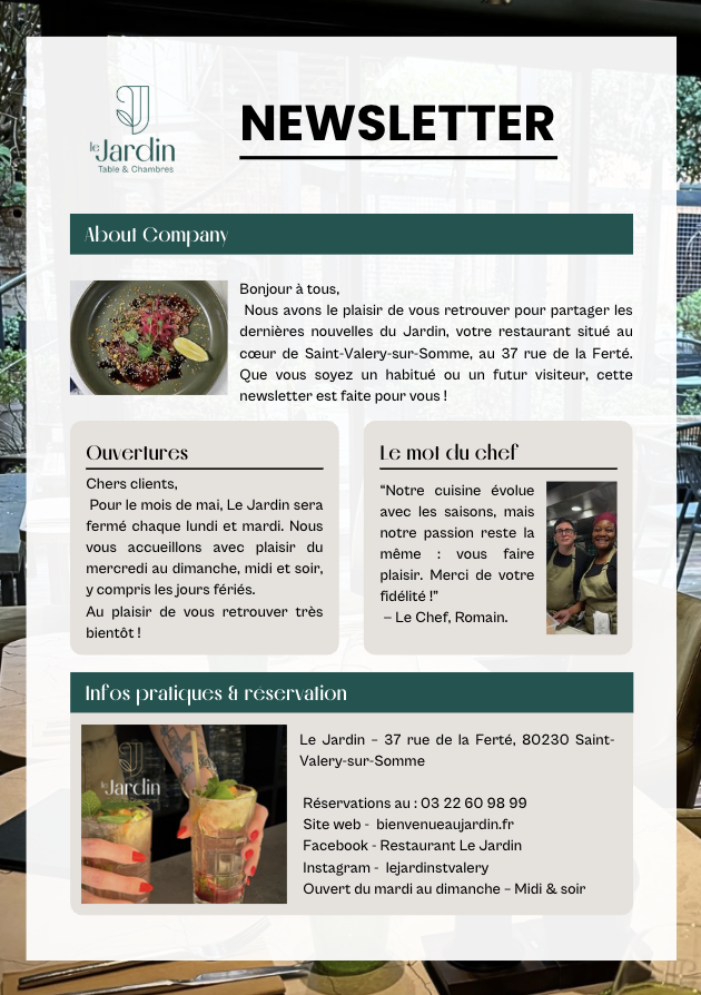 Nous avons le plaisir de vous inviter à vous abonner à notre newsletter ! En vous inscrivant, vous serez parmi les premiers à découvrir nos nouvelles créations culinaires, nos offres exclusives et nos événements spéciaux.
